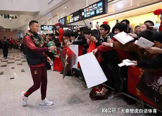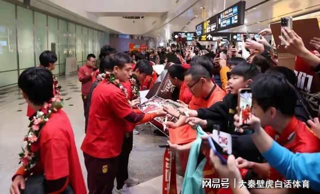 看到有这么多前来接机的球迷,球队上下非常高兴,球员包括教练组围着编织的鲜花,穿着红色的短袖T恤,笑容满面地与现场球迷互动、签名。